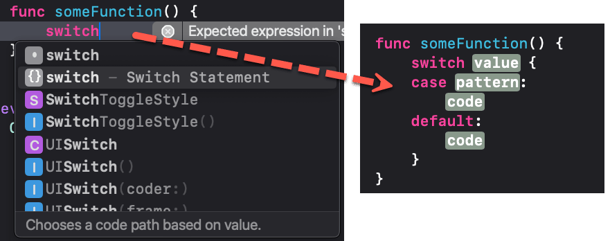 For example, if you want to get the basic format for a Switch statement, you can just start typing switch and then hit the tab key after selecting the Xcode code snippet and it will expand to provide you with the code with 4 placeholders. One for the value, one for a single case pattern and two for your code blocks. Tabbing will highlight each of the placeholders in your tint color and typing will replace the placeholder with whatever you type.