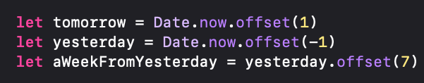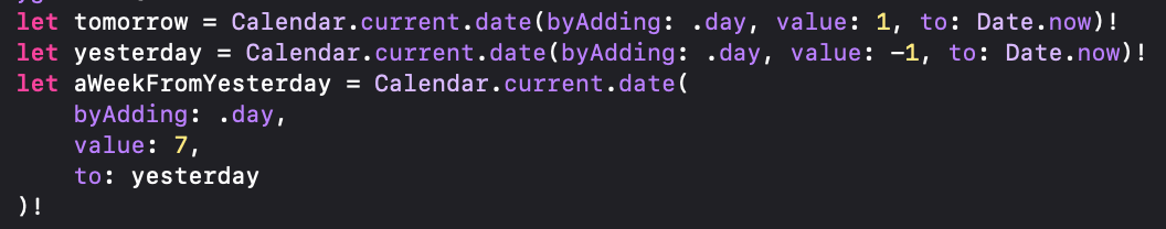 There are many ways to construct dates. You can calculate them by adding seconds or time intervals from a reference date, build them from DateComponents using a Calendar, or parse them from strings using DateFormatter with custom formats. However, the easiest approach, by far, is using Calendar.date(byAdding:value:to:wrappingComponents:) to generate relative dates.